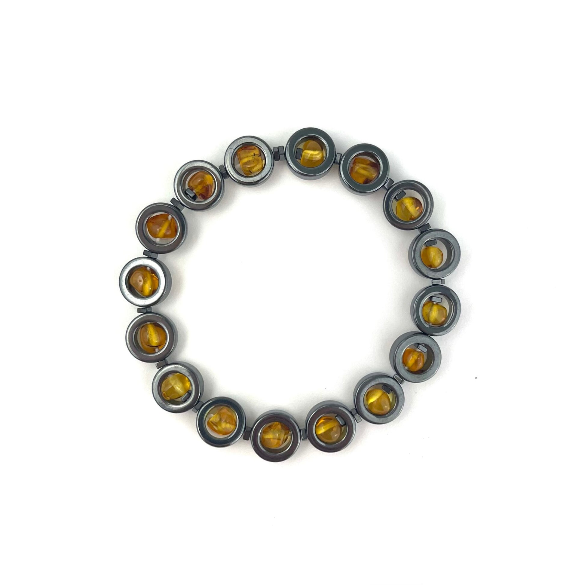 Polished Amber Beads and Hematite Stone Honey Color Bracelet